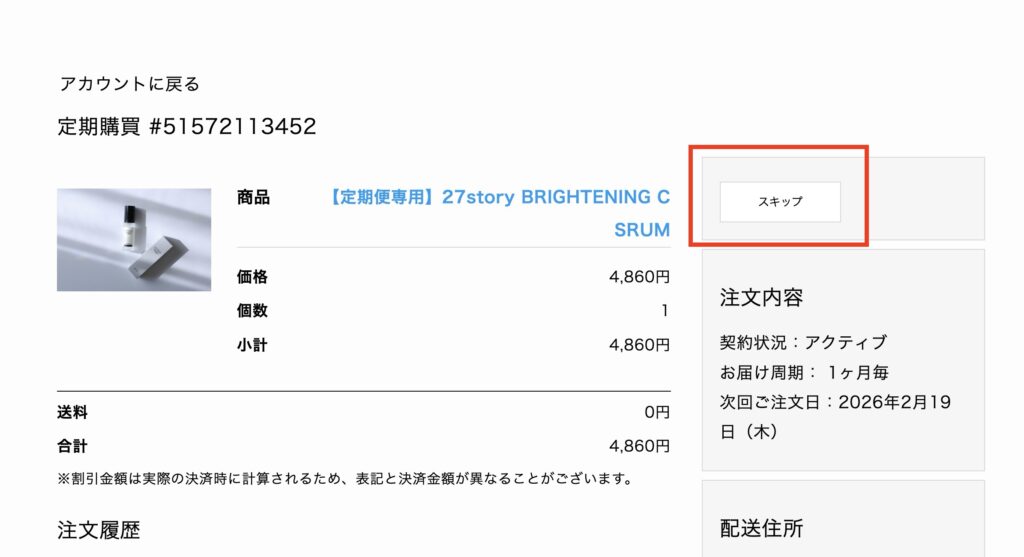 もし、1ヶ月毎ではなく、任意の月日(例:1月27日決済予定→2月15日決済予定)にスキップしたい場合は、27story.jp サポートまでお問い合わせください。
