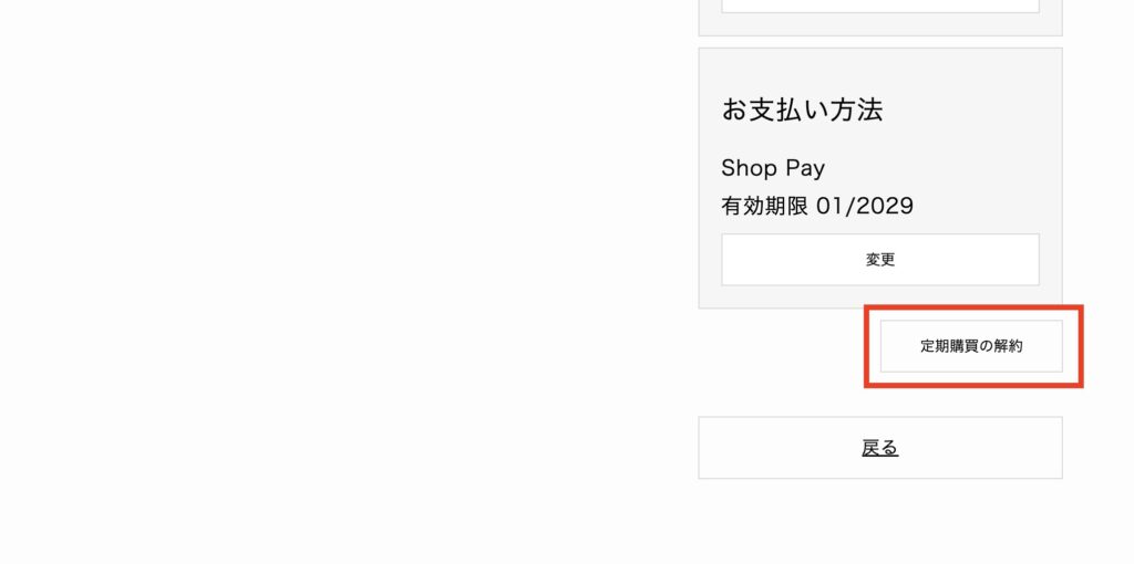 お支払い方法の下部より、「定期購買の解約」をクリック。